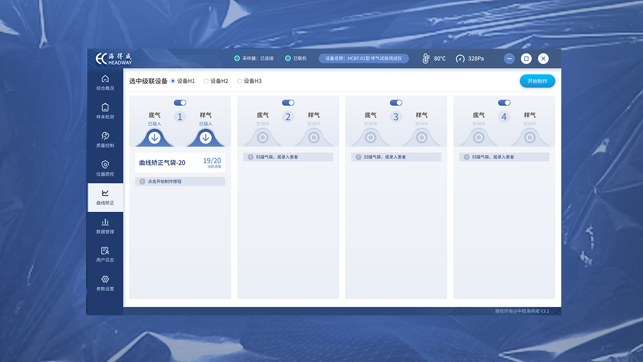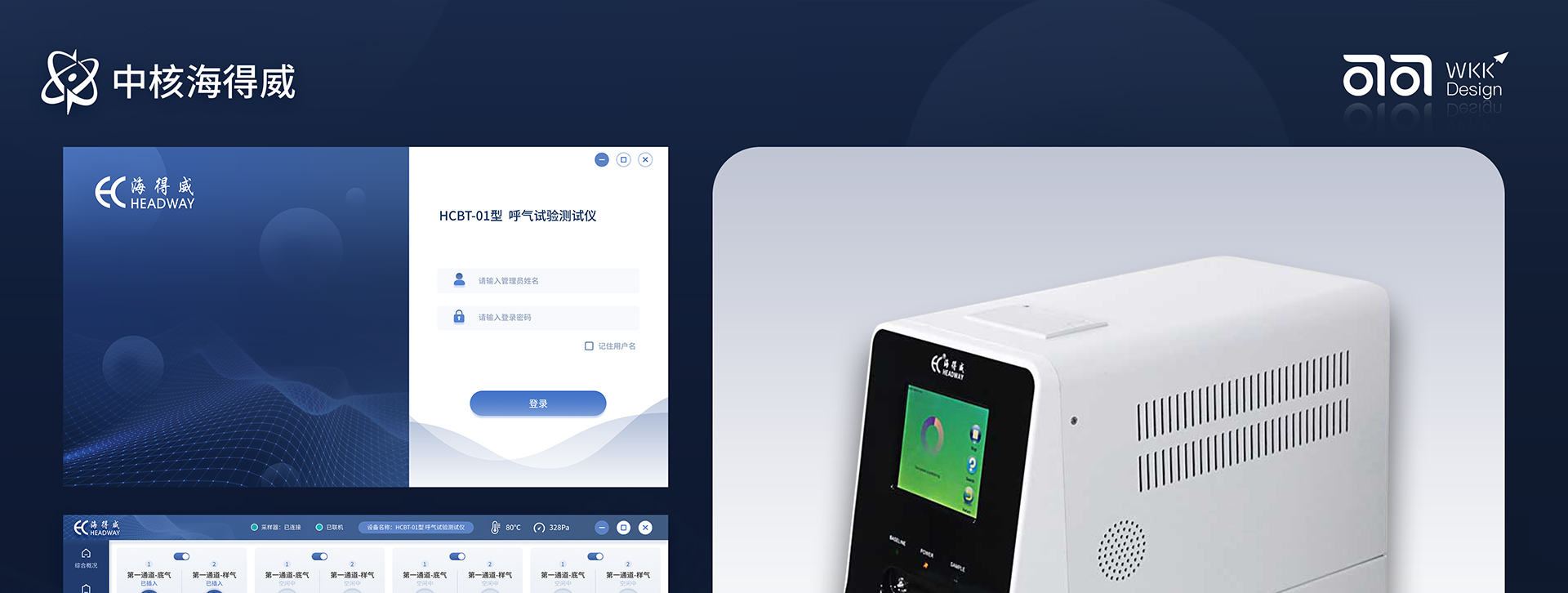唯可可用研团队和中核海得威团队对目标人群的用户调研访谈和竞品分析,用蓝色作为底色塑造现代科技感。 将UI界面与呼吸机紧密结合,比如,在界面内添加圆形、球体,制作气体动效;用界面的明暗关系制作立体效果,使画面更加通透有质感。